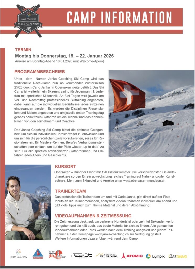 Unter dem Namen Janka Coaching Ski Camp wird das traditionelle Race-Camp nun ab kommender Wintersaison 25/26 durch Carlo Janka in Obersaxen weitergeführt. Das Ski Camp ist weiterhin ein Skirenntraining für Jedermann & Jedefrau mit sportlicher Skitechnik. An fünf Tagen wird jeweils am Vor- und Nachmittag professionelles Skitraining angeboten, dabei kann auf die individuellen Bedürfnisse jedes einzelnen eingegangen werden. Es werden die Disziplinen Riesenslalom und Slalom angeboten und am jeweils ersten Trainingstag geht es beim freien Skifahren um die Technik und das Kennenlernen von den Teilnehmern und Coaches.